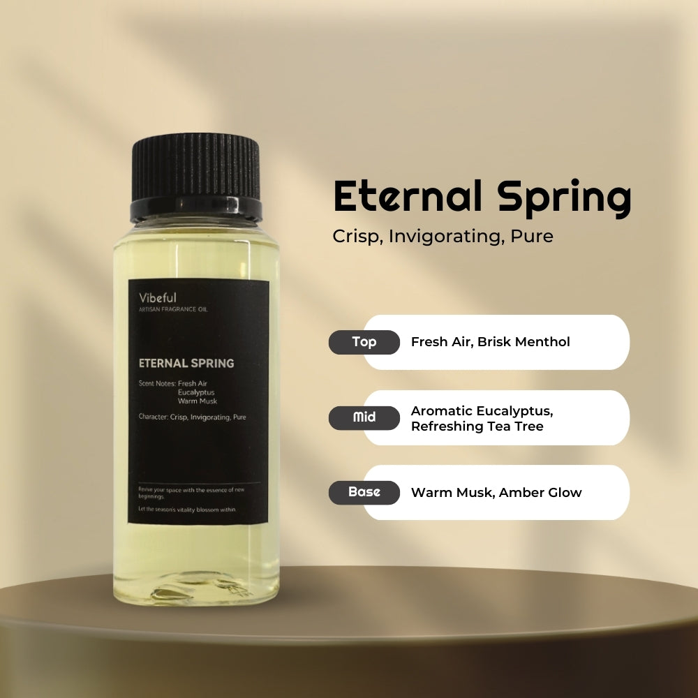 Scent Experience: Embarking on its sensory journey with the briskness of Fresh Air and the clarity of Menthol, Eternal Spring sweeps through your space like a gentle breeze. The heart of Eucalyptus and Tea Tree beckons with their clarifying and refreshing aromas, evoking the pure essence of springtime growth. The base notes wrap the experience in the comforting warmth of Musk, softly illuminated by the subtle radiance of Amber, creating a scent that resonates with the season of rejuvenation.