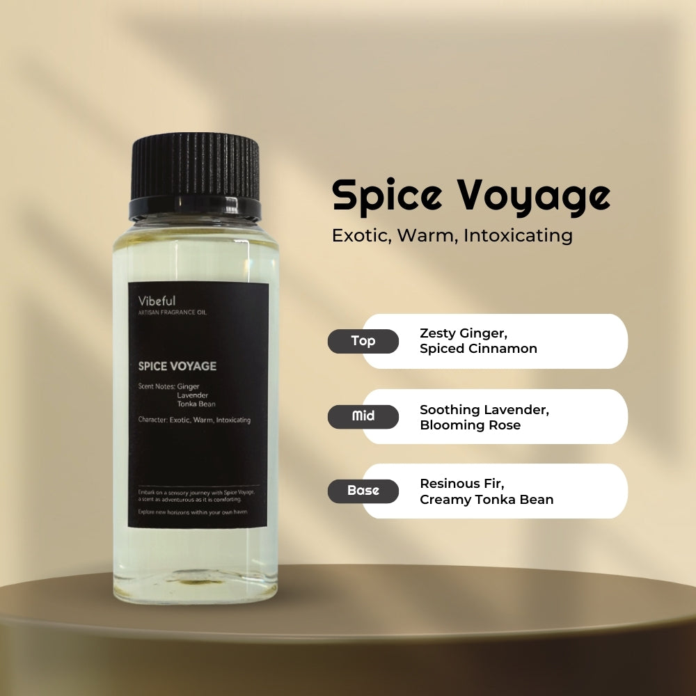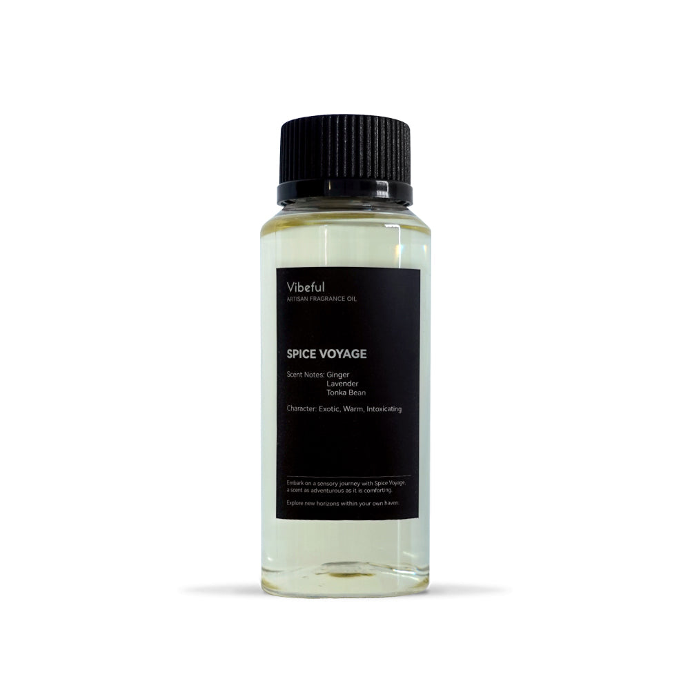 About the Scent: Spice Voyage Diffuser Oil by Vibeful embarks on an olfactory expedition, charting a course through the spice markets of the exotic East and the lush gardens of the serene West. It's a journey for the senses, crafting a narrative that is as adventurous as it is comforting.